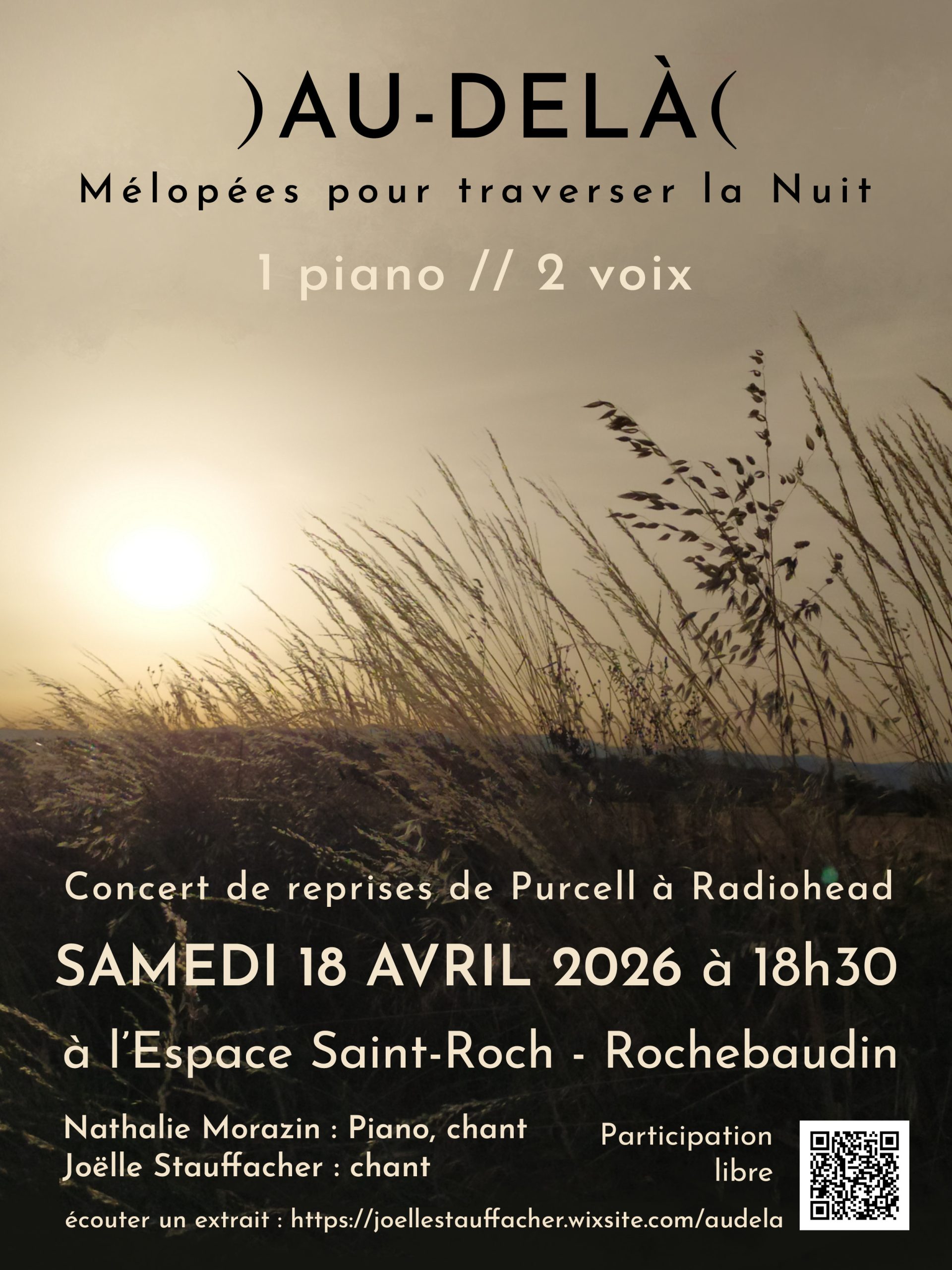 - 18 avril 2026 : Au Delà – Mélopées pour traverser la Nuit : Concert de reprises (folk, Beatles, Radiohead, Schubert….) originalement arrangées pour deux voix et piano sur le thème de la mort et de l’au-delà. Contrairement à ce que l’on pourrait croire, cela peut être joyeux et lumineux